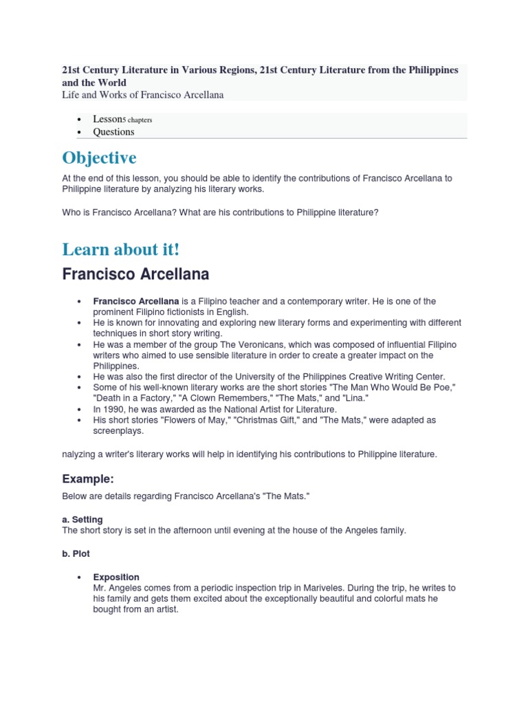 The mats by francisco arcellana the story entitled the mats was written by francisco arcellana one of the admirable literary filipino artists.